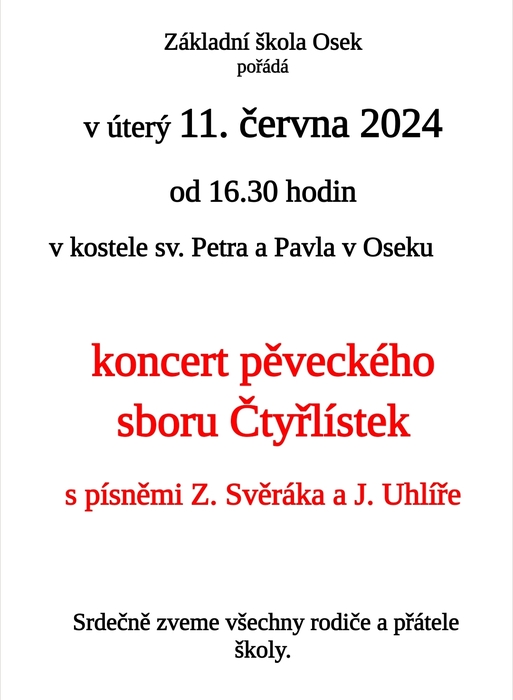 Koncert pěveckého sboru Čtyřlístek se uskuteční v úterý 10. 6. 2024 od 16.30 v kostele sv. Petra a Pavla v Oseku.